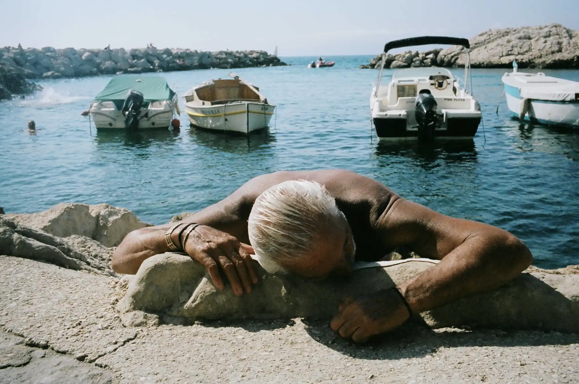 The Figure 1, a work from Eric Kim from 2013 show us a man laying down in the rocks. The man seems to be in a bay and it's clearly enjoying the sun. However, I do not believe that is comfortable to laying down in such uneven floor. The camera angles tells us that the artist was lying down and very close to the subject to be able to capture the moment. The man probably was having a nap and maybe he did not understand that someone was taking his picture.